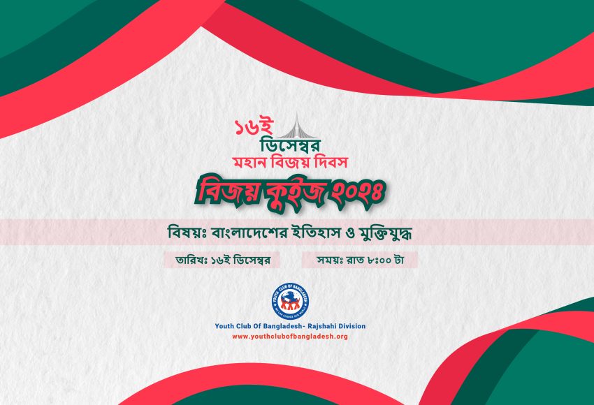 ইয়ুথ ক্লাব অব বাংলাদেশ – রাজশাহী বিভাগ বিজয় দিবস উদযাপন উপলক্ষে “বিজয় কুইজ-২০২৪”, নামক একটি অনলাইন কুইজ আয়োজন করে এই কুইজের মূল প্রতিপাদ্য ছিল ‘বাংলাদেশের ইতিহাস ও মুক্তিযুদ্ধ’। কুইজ প্রতিযোগিতাটি ছিল সকলের জন্য উন্মুক্ত এবং সম্পূর্ণ ফ্রি।