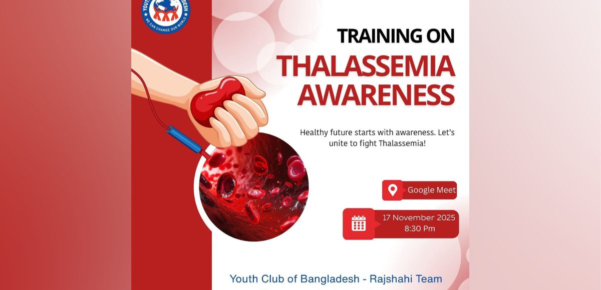 On 17th November 2025, Youth Club of Bangladesh – Rajshahi Team successfully organized an online Thalassemia Awareness Training to raise awareness about this genetic blood disorder and promote social health consciousness among members and participants.